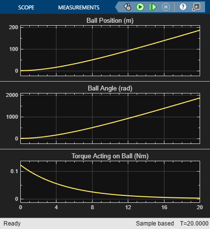 The ramp has a 30-degree slope, and the ball starts at rest. Gravity applies a force along the slope, causing the ball to roll. A linear damper models air resistance, so the ball reaches terminal velocity when damping balances torque due to the gravitational torque.