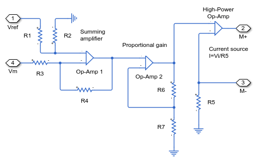 El controlador proporcional más integral se implementa utilizando amplificadores operacionales, cuya etapa final se configura como una fuente de corriente. A continuación, se acciona un motor de torque con términos de resistencia e inductancia modelados. El motor de torque acciona directamente el distribuidor, que a su vez controla el circuito hidráulico principal que alimenta el cilindro hidráulico. Por último, el cilindro acciona una carga mecánica genérica.