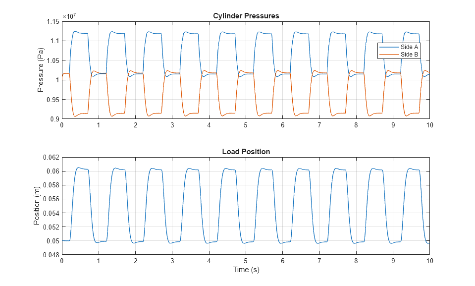 La siguiente figura muestra las presiones del cilindro y la posición de la carga representadas en una gráfica de MATLAB. También puede ver estos datos en Simulation Data Inspector haciendo clic en el hipervínculo View cylinder pressures en el área de diseño del modelo o haciendo clic en el botón Data Inspector en la pestaña Simulation del modelo.