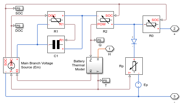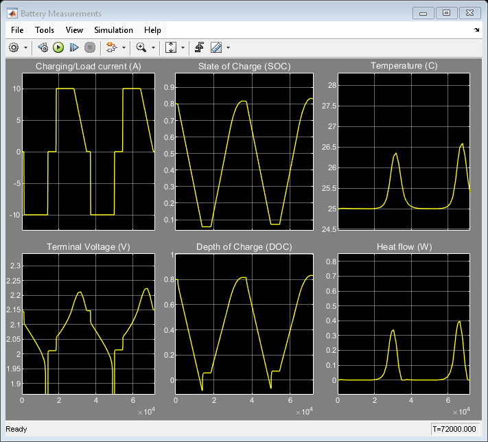 En esta simulación, la batería se descarga inicialmente a una corriente constante de 10 A. Luego, la batería se recarga a una corriente constante de 10 A hasta el estado inicial de carga. Después, la batería se descarga y se vuelve a recargar. Para crear un modelo de la temperatura de la batería se utiliza un modelo térmico sencillo. Se presupone que la refrigeración se produce principalmente por convección y que el calor procede principalmente de una resistencia interna de la batería, R2. Se puede crear un modelo de una batería estándar de ácido-plomo de 12 V conectando varias copias del bloque de la celda de batería de 2 V en serie.