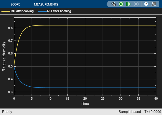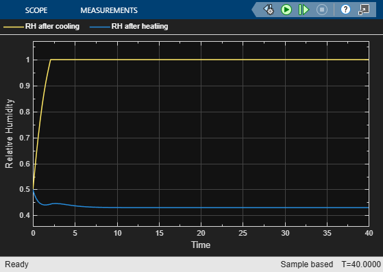 Simulate the model and open the Scope block. The relative humidity in the Cooling pipe reaches 1, which means that condensation can occur. The relative humidity leaving the Heating pipe is 0.5, which is the same as the relative humidity in the environment.
