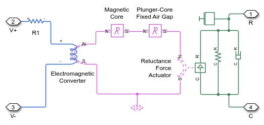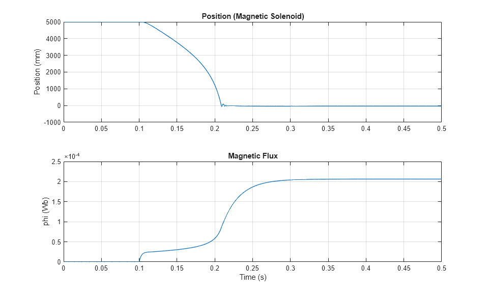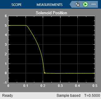 Este modelo es similar al modelo de ejemplo SolenoidExample, salvo que, en este caso, el solenoide se ha modelado utilizando bloques magnéticos en lugar de bloques de señal física. La corriente a través del solenoide produce una fuerza magnetomotriz (FMM), que conduce un flujo a través del núcleo magnético del solenoide. Se produce una fuerza de reluctancia que lleva al émbolo a cerrar el entrehierro, inicialmente de una longitud de 5 mm. El flujo en el núcleo magnético aumenta a medida que la longitud del entrehierro disminuye.