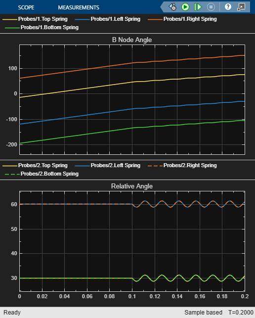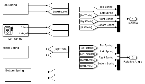 Simscape Probe blocks log the B port angle and the relative angle between ports of each spring. The B port of each spring corresponds to the end of that spring that is attached to the orange plate.