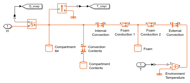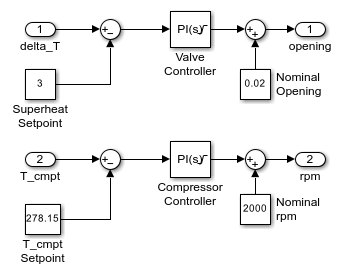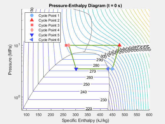Este ejemplo modela un ciclo de refrigeración por compresión de vapor en el que la parte de alta presión del ciclo opera en la región de fluido supercrítico. El refrigerante es dióxido de carbono (CO2), denominado también R744 en esta aplicación.
