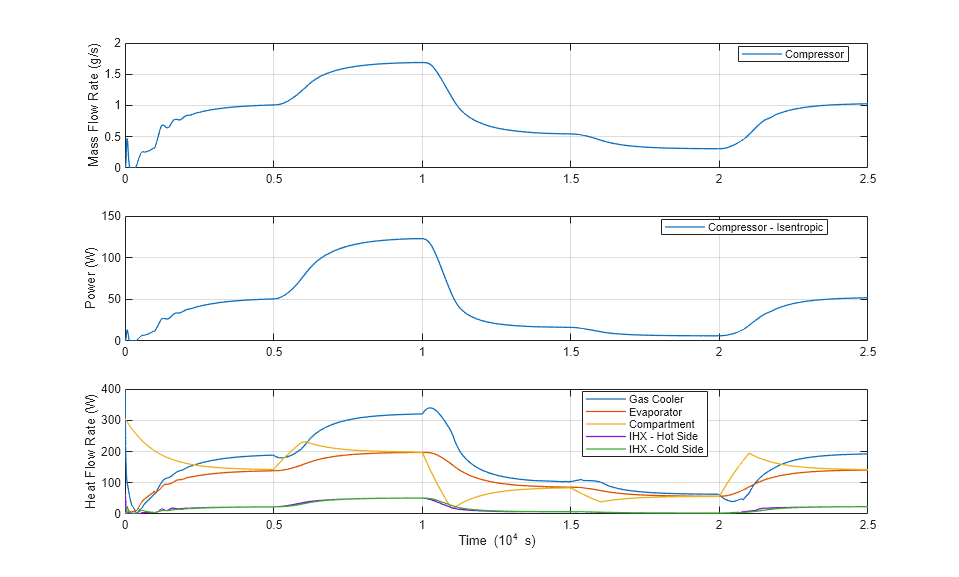Esta gráfica muestra el caudal másico, la entrada de potencia isentrópica del compresor y el caudal de calor del ciclo. El caudal de calor del enfriador de gas y del evaporador representan el rechazo y la absorción de calor del ciclo, mientras que el caudal de calor de IHX es una transferencia de calor dentro del ciclo mediante el intercambiador de calor interno.
