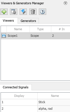 Para equipar el modelo sin añadir bloques, considere la opción de utilizar Viewers & Generators Manager. Para abrir el administrador, en la pestaña Simulation, en la sección Prepare, seleccione Viewers Manager. En este ejemplo, Viewers & Generators Manager está configurado para registrar dos señales, Stick y alpha, en el bloque Scope denominado Scope1.