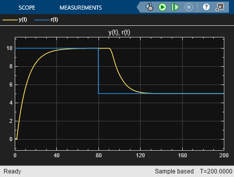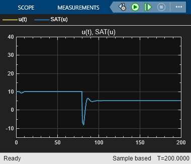 La salida medida de la planta y(t) y la salida del controlador u(t) responden casi inmediatamente a los cambios en el punto de referencia. Cuando el valor del punto de referencia es 10, observe que la salida del controlador u(t) se reduce para estar dentro del intervalo del actuador.