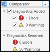 | Count of the diagnostic messages that are added and removed. Select to view the details of the added error and warning messages. |