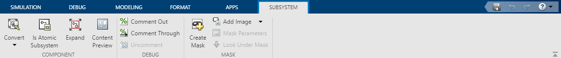 When you select a model component, a contextual tab activates, displaying the tools to assist you in a step in your workflow. For example, when you select a subsystem block, the Subsystem tab appears. If you select a Stateflow chart, the State Chart tab appears. When the block or chart is no longer selected, the contextual tabs disappear.