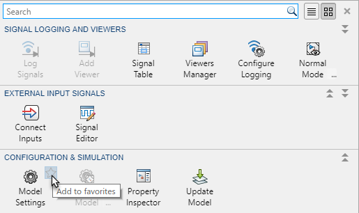 The quick access toolbar contains frequently used options such as save, undo, and redo. To customize the quick access toolbar, see Access Frequently Used Features and Commands in Simulink.