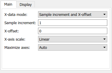 Specify the spacing between samples along the x-axis as a finite numeric scalar. The input signal is only y-axis data. X-axis data is set automatically based on both the Sample increment and X-offset values. For example, when X-offset is 0 and Sample increment is 1, the x-data for the input signal is set to 0, 1, 2, 3, 4, … . If you set Sample increment to 0.25, the x-axis data becomes 0, 0.25, 0.5, 0.75, 1, … .