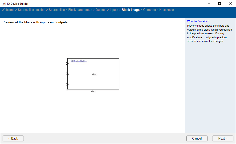 On the Block image page, view the preview of the block with the inputs and outputs you added. Click Next to continue.