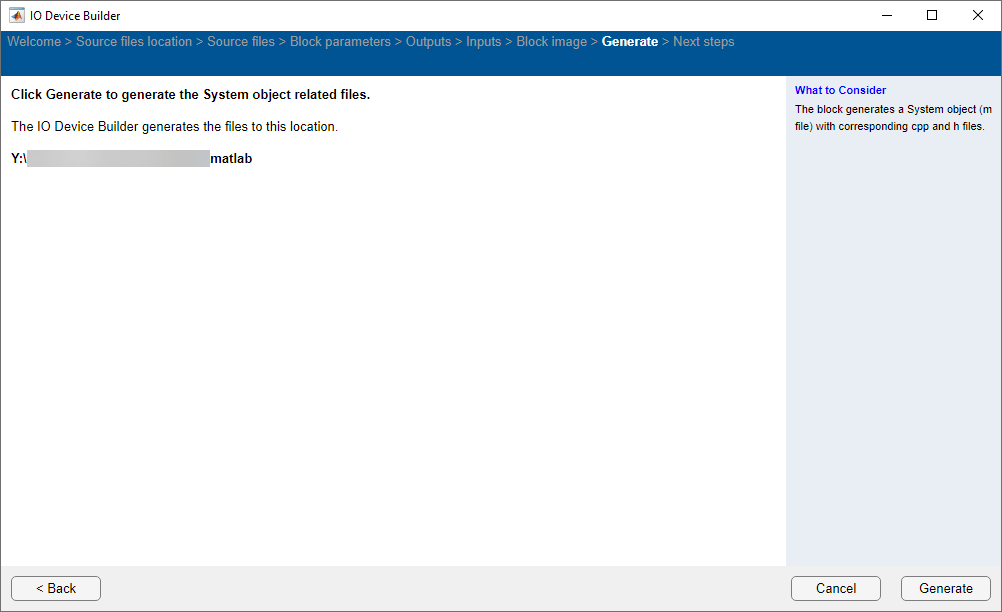 The app displays the location of the System object file on the Generate page. Choose the Select to generate a C++ driver option, if you want to generate a C++ file.