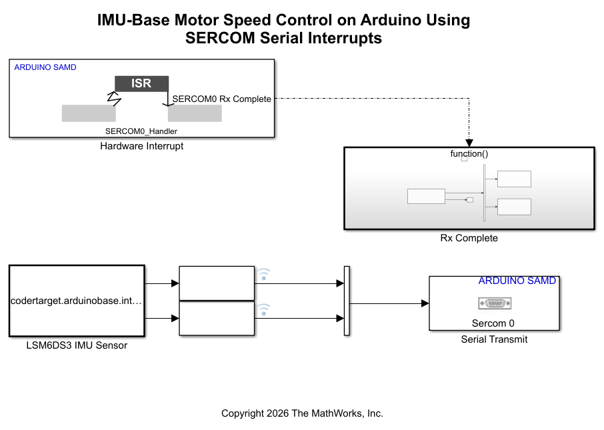 arduinoTargetSERCOMInterruptmodel to exchange data over different serial or SERCOM ports on the Arduino hardware. Using different ports let you use flexible communication setups or multiple simultaneous data streams.When using SERCOM ports for data exchange, add a TX complete interrupt to trigger actions such as running the motor speed computation algorithm immediately after data transmission is over.