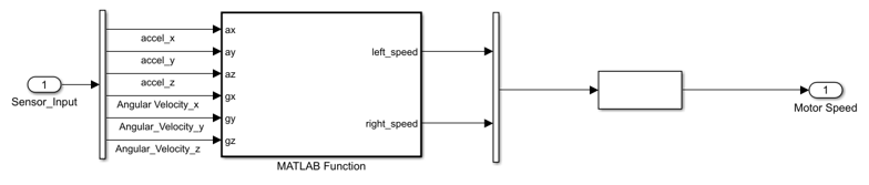The following diagram shows the Get Motor Speed subsystem. The MATLAB Function block calls the custom function compute_motor_command.