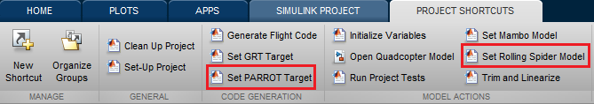 3. With the asbQuadcopter Simulink project open, click the Project Shortcuts tab and perform one of the following tasks based on the type of minidrone connected: