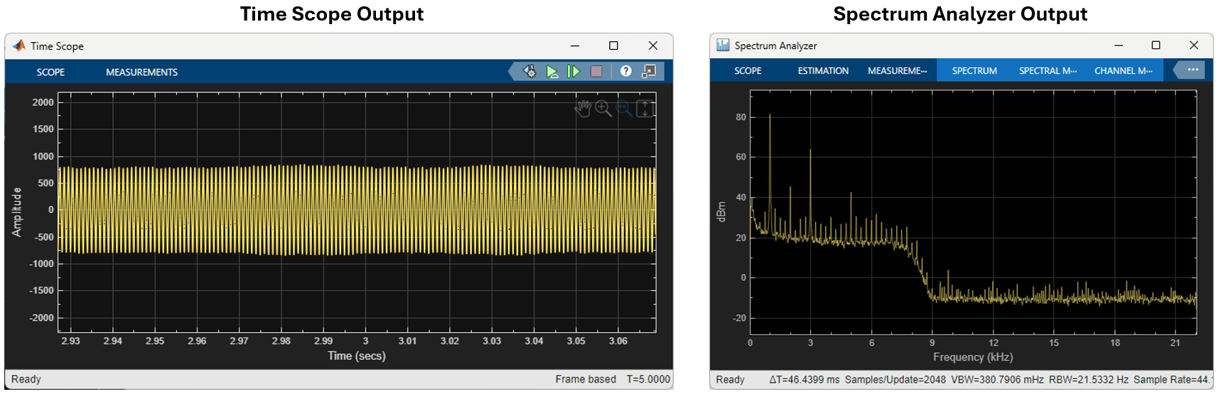 6. Observe the output in the Spectrum Analyzer and Time Scope blocks. Observe the shift in the peak frequency as it drops from 1000 Hz to 500 Hz on the Spectrum Analyzer.