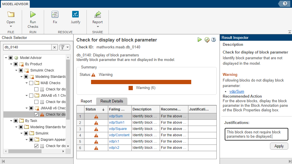 The Model Advisor ensures your model adheres to specific standards and guidelines. However, there may be cases where certain warnings or issues are acceptable for your specific model. To document these exceptions, you can add justifications directly in the Model Advisor. To add justifications:
