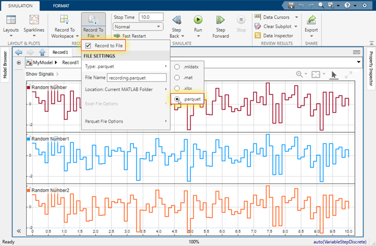 set_param("MyModel/Record","RecordToFile","on","FileName","myRecording.parquet")