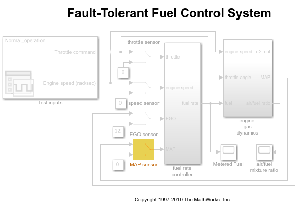 In the slvnvdemo_fuelsys_officereq model, the MAP sensor block has the specified keyword test, which was found in View Information about a Link. Filter the highlighted links so that only blocks that have associated links with the keyword test are highlighted: