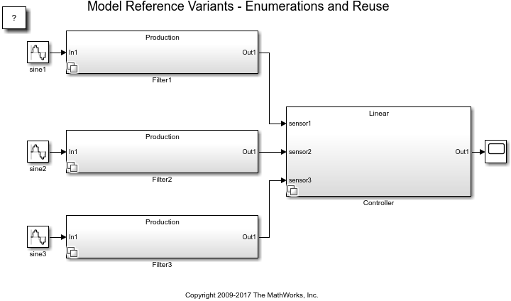 This example shows how to use model reference variants. A Model block is used to reference one Simulink® model from another Simulink model. A Variant Subsystem block can contain Model blocks as variants. A variant describes one of N possible modes in which a Variant Subsystem block can operate. Each variant references a specific model with its associated model-specific arguments. For a given Variant Subsystem block, only one variant is active during simulation. You can switch the active variant by changing the values of variables in the base workspace or by manually overriding variant selection using the Variant Subsystem block dialog box.