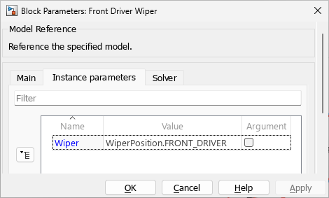 • In the top-level model, for each instance of the slexVariantParameterWiper model, the model argument Wiper is set to an instance-specific value corresponding to the wiper position. During simulation, the active choice of variant parameters in the referenced model vary for each instance based on the value of Wiper set from the top-level model. This image shows the instance value specified for Wiper in the Block Parameters dialog box of the Model block Front Driver Wiper.