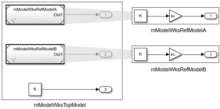 mModelWksTopModel with a constant block that uses variant parameter K and two Model blocks that refer to mModelWksRefModelA and mModelWksRefModelB. Both mModelWksRefModelA and mModelWksRefModelB have the same model hierarchy with two variant parameters K and kv.
