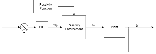 • Architecture — This figure shows a typical way of implementing Passivity Enforcement blocks to modify PID controller actions.