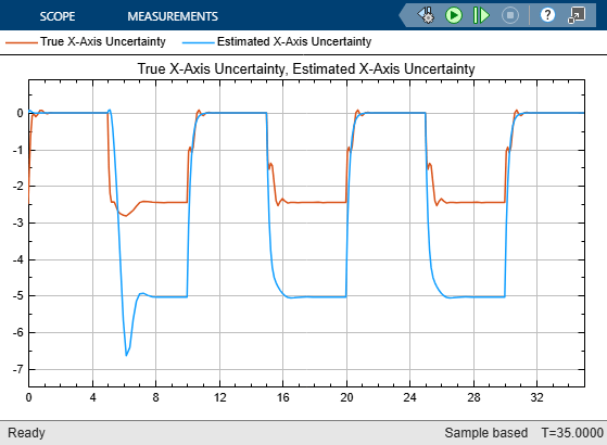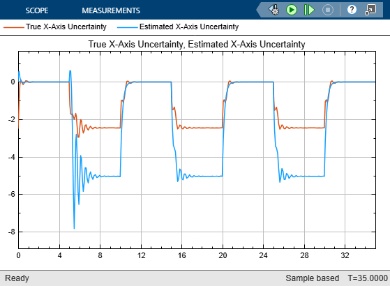 The controller estimates an accurate y-axis uncertainty model. The uncertainty model for the x-axis has the correct sign, though the magnitude is lower than that of the true uncertainty. Both uncertainty models show significant transients in the uncertainty estimate, especially during the first step change in the reference signals.