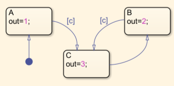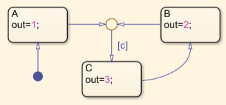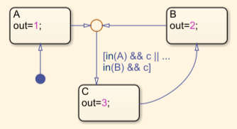 Consider a Stateflow chart that contains three states and one junction. States A and B transition to a junction, and the transition exiting the junction has a condition, c that transitions to state C.