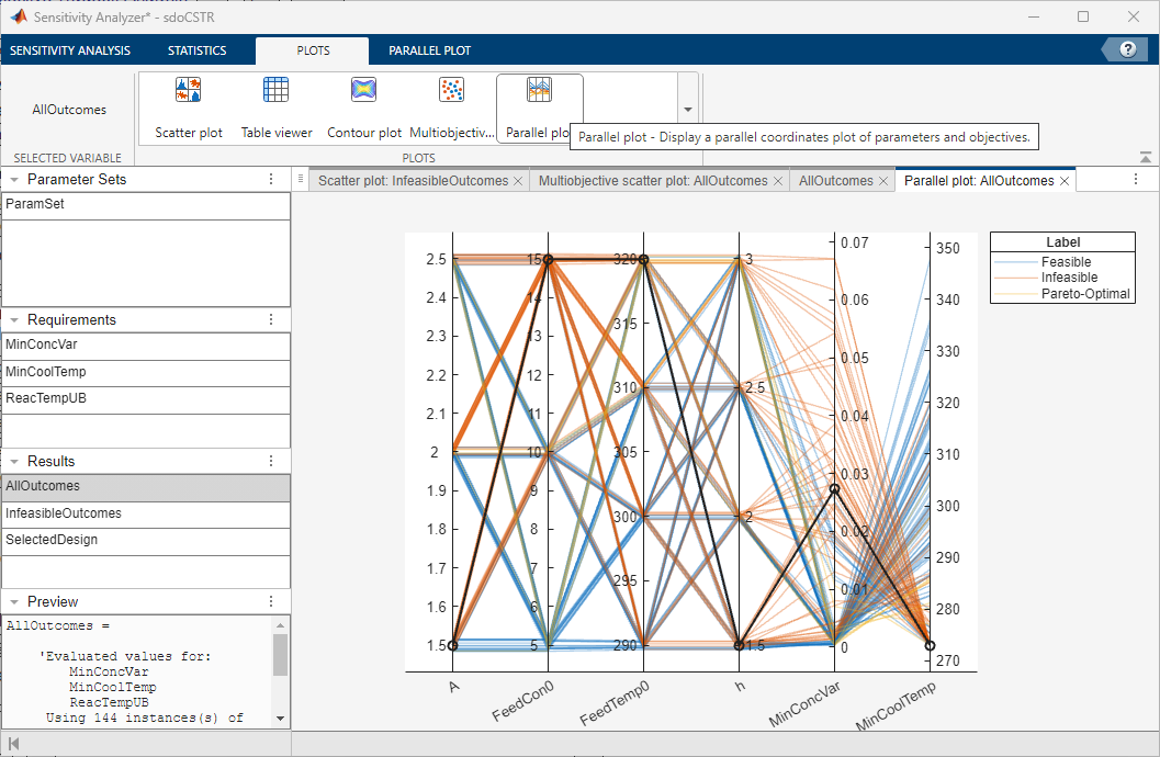 For more information on the multiobjective scatter plot and the parallel plot, see Interact with Plots in the Sensitivity Analyzer.