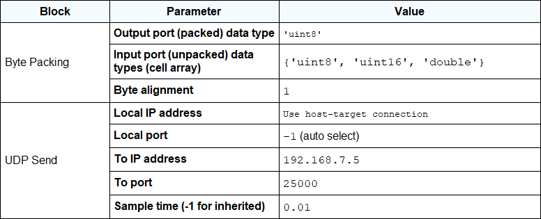 The Byte Packing block settings match the settings of the Byte Unpacking block of slrt_ex_udpsendreceiveA.