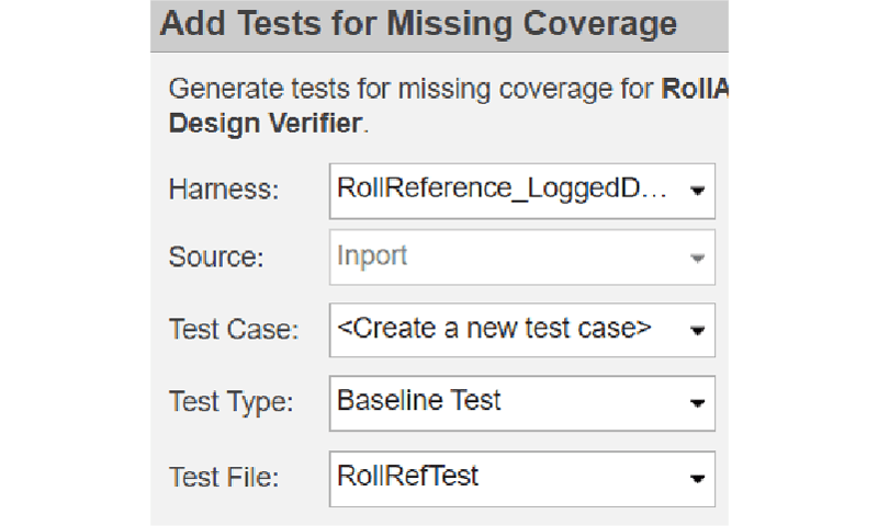 Genere entradas de prueba en Simulink Design Verifier para ampliar la cobertura o replique las condiciones de errores de diseño. Añada las pruebas generadas al archivo de prueba.