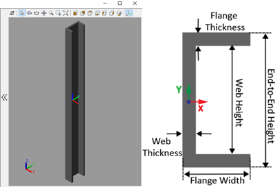 The Flexible Channel Beam block models a slender beam with a C-shaped cross-section, also known as a C-beam. The C-beam consists of two horizontal components, known as flanges, that are connected by one vertical component, which is called a web. The C-beam can have small and linear deformations. These deformations include extension, bending, and torsion. The block calculates the beam cross-sectional properties, such as the axial, flexural, and torsional rigidities, based on the geometry and material properties that you specify.