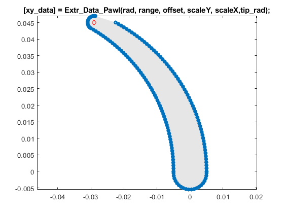 This plot shows the extrusion data for the pawl. This was created in MATLAB and was used to generate the location for the frame where the contact geometry is placed at the tip of the pawl.