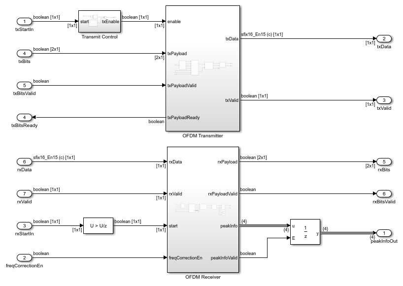 • For more information on the transmitter and receiver implementations see the Introduction to Custom OFDM (Wireless HDL Toolbox) example.