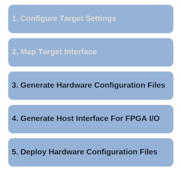 To generate and deploy the hardware configuration files for the AMD ZCU111 RFSoC, use the HDL Coder™ IP core generation workflow. The workflow steps are shown. The model is pre-configured with the required target settings and interface mapping for steps 1 and 2 respectively. For more information on configuring a model to target an RFSoC with the IP core workflow see the Transmit and Receive Tone Using IP Core Generation Workflow on RFSoC Device example.