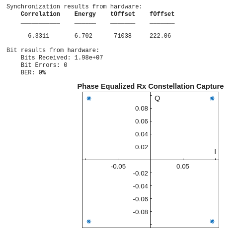 On a successful run, synchronization results, bit error results, and the equalized data symbol constellation are displayed.
