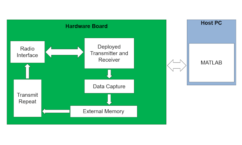 With the default verification setup the transmitter and receiver run in real-time on the hardware target. MATLAB configures control registers for the transmitter and receiver.