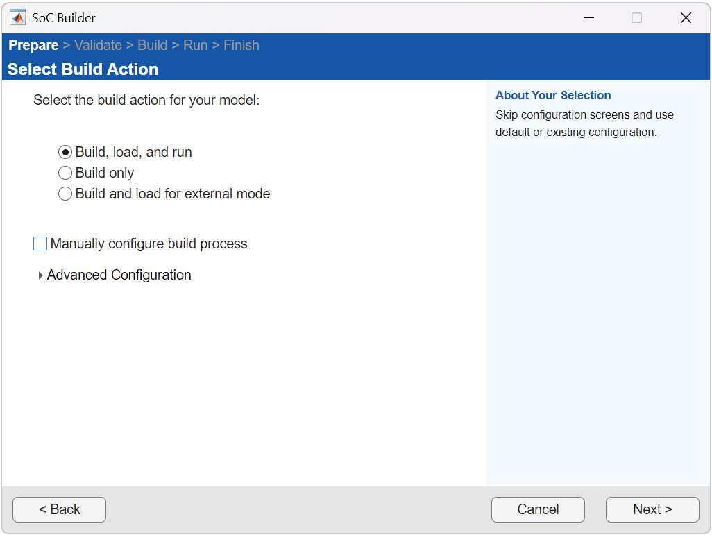 6. On the Select Build Action screen, select Build, load, and run. Clear Manually configure build process. Click Next.