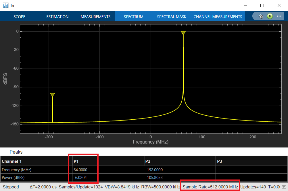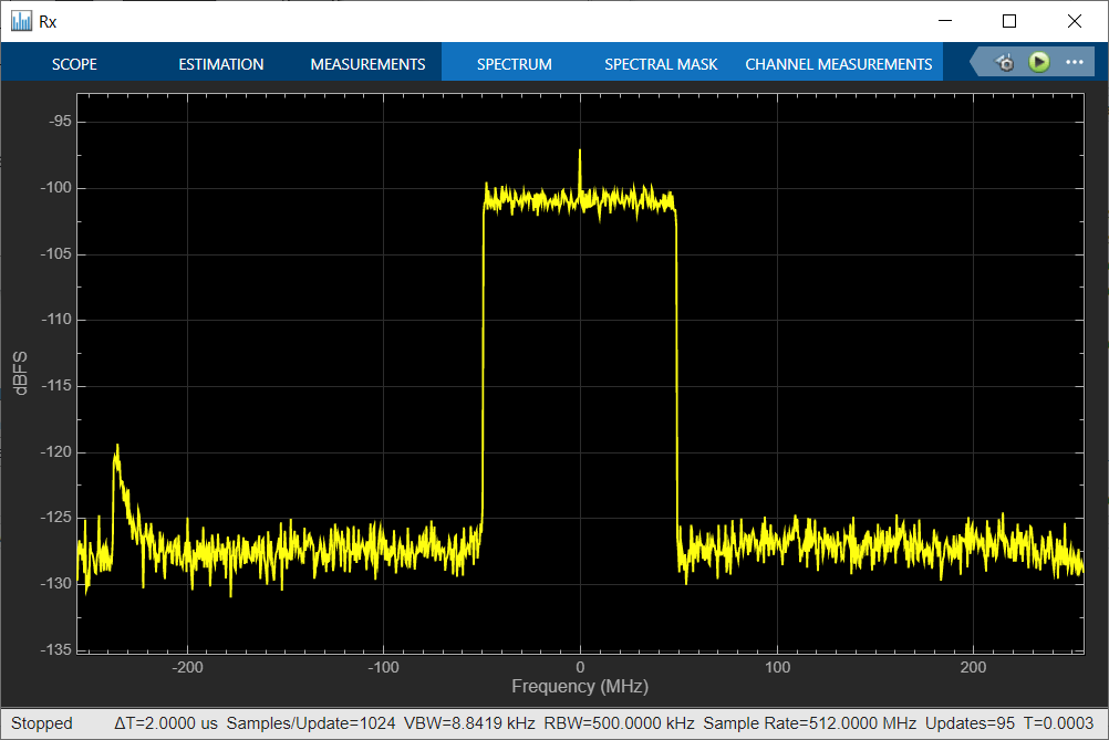 Observe that in the Rx spectrum analyzer block, the RFDC shifts the received signal by the provided NCO frequency at the ADC output. The RFDC downsamples the received signal by the provided decimation factor at ADC output.