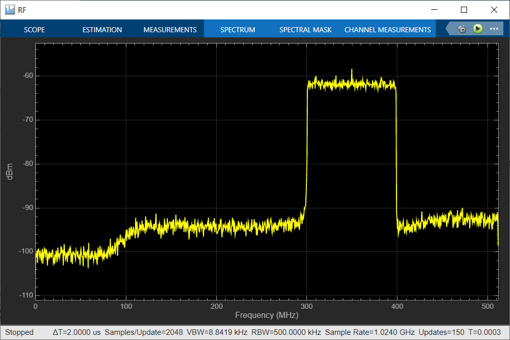 Run the simulation again after updating the parameters. By increasing the interpolation and decimation modes, you eliminate the unwanted frequency bands in the spectrum of the received waveform, as this figure shows.