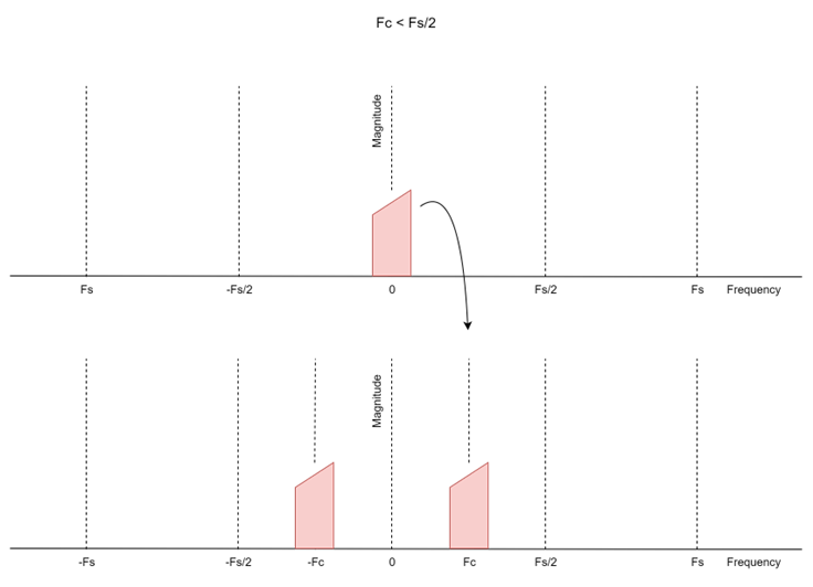 Interpolation filters upsample the input signal by an integer-valued factor. The decimation filters downsample the input signal by an integer-valued factor. A complex mixer shifts the input signal frequency spectrum to center it around the provided carrier frequency (Fc). When you choose a carrier frequency that is less than half of the sampling rate (Fs), the original signal shifts such that it is centered around the provided carrier frequency.