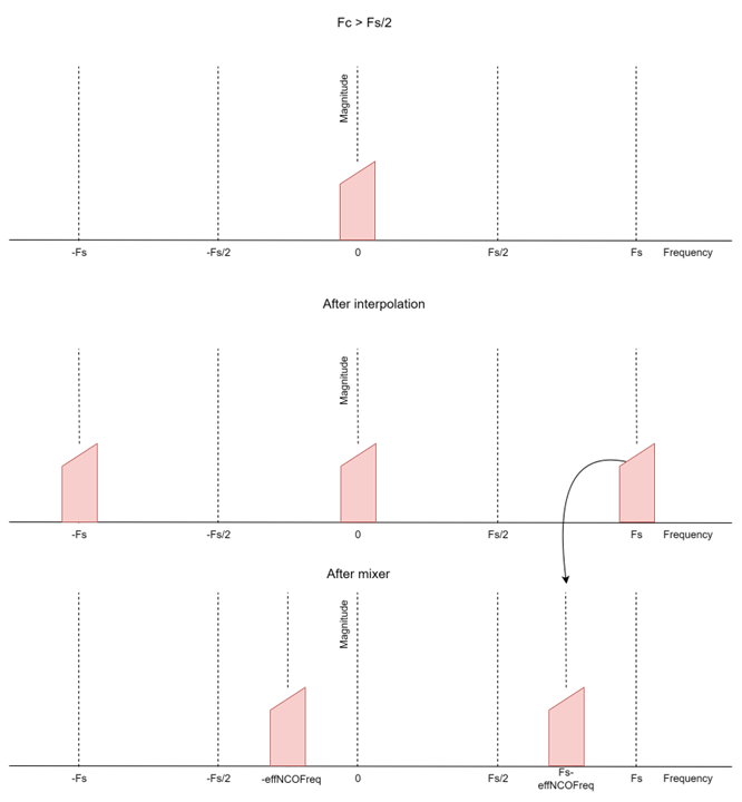 In another scenario, when you choose a carrier frequency Fc that is greater than half of the sampling rate Fs, the RF Data Converter block calculates the effective frequency (effNCOFreq) for zone 1 and shifts the image of original signal to center it around the provided carrier frequency.