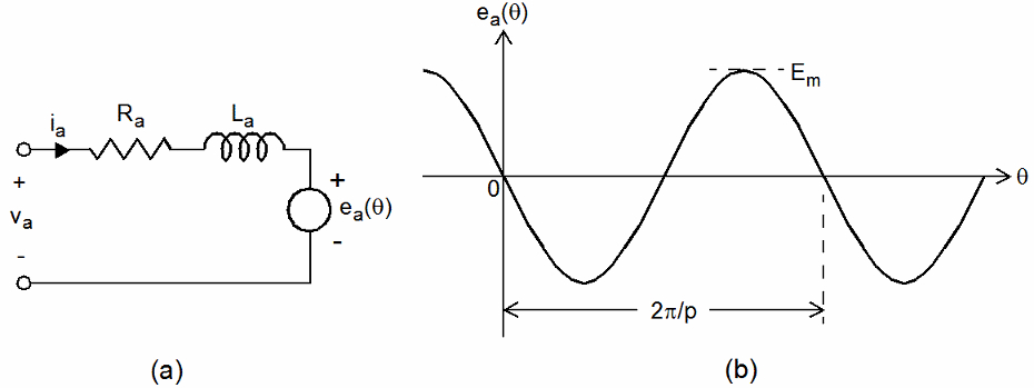 This figure shows the equivalent circuit for one phase in a permanent-magnet (PM) or hybrid stepper motor.