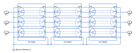 The AC Cable (Three-Phase) block includes inductances and mutual inductances between each phase, sheath, and return path. Therefore, you can connect an ideal electrical reference block to both return ports, g1 and g2, while maintaining loss modeling in the Earth- or neutral-return line.