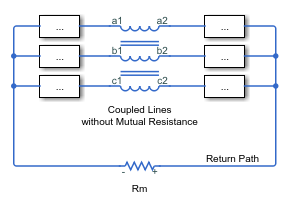 If the three lines share a common return path, you can model the resistance of this return path using the Mutual resistance parameter Rm. This workflow is equivalent to setting the Mutual resistance to zero and explicitly modeling the return path resistance Rm, as shown in this diagram.