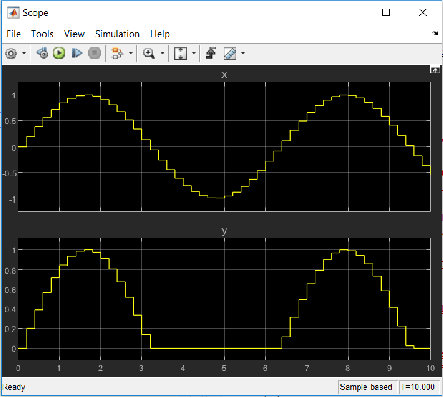 sim("rectify");4. Haga doble clic en el bloque Scope. El bloque Scope muestra los gráficos de las señales de entrada y salida a los gráficos.
