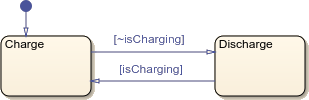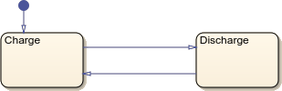 Para modelar estos requisitos, se crea un gráfico que contiene dos estados, Charge y Discharge, que representan los modos de funcionamiento del sistema de baterías.