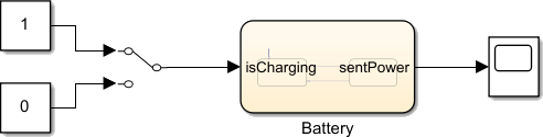Para representar el sistema de baterías que se conecta o desconecta de una fuente de potencia externa, añada un bloque Manual Switch al área de diseño de Simulink. Conecte la salida a la entrada del bloque Chart.